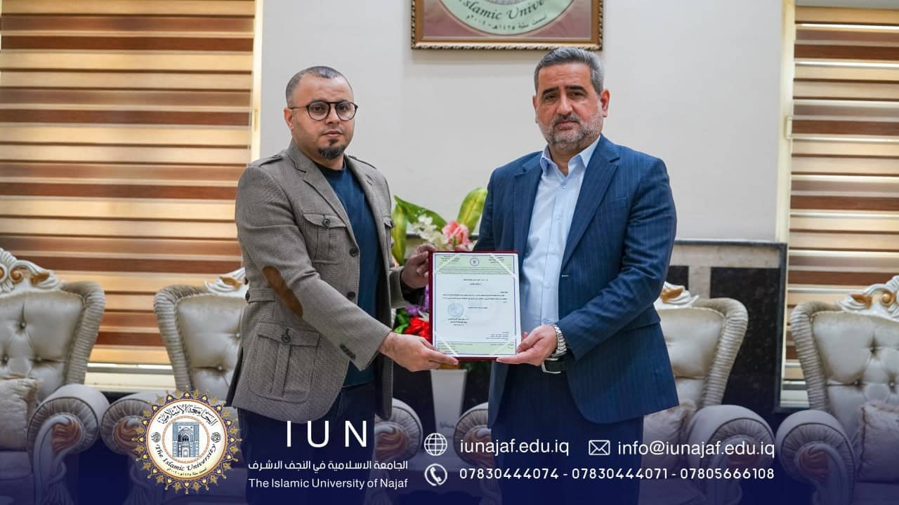 Dr. Ammar Abdel Amir Al-Salami, President of the Islamic University, honoured Dr. Ahmed Hussein Al-Khayyat, Director of the Quality Assurance and University Performance Department, and praised his distinguished efforts made towards the Islamic University and his tireless efforts to bring it to the level of competition for first places in local and international classifications, according to which it has become more competitive among International universities. (HTH)