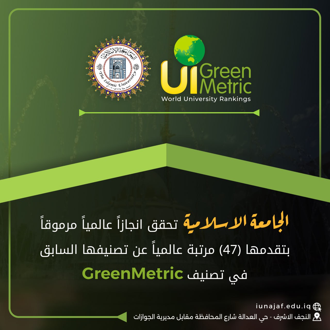 Islamic University, Najaf— The Islamic University in Najaf Al-Ashraf has achieved a remarkable milestone by climbing 47 positions in the global UIGREEN METRIC ranking. The university now ranks third among private institutions in Iraq and tenth overall among all Iraqi universities, both public and private, securing the 392nd spot worldwide.